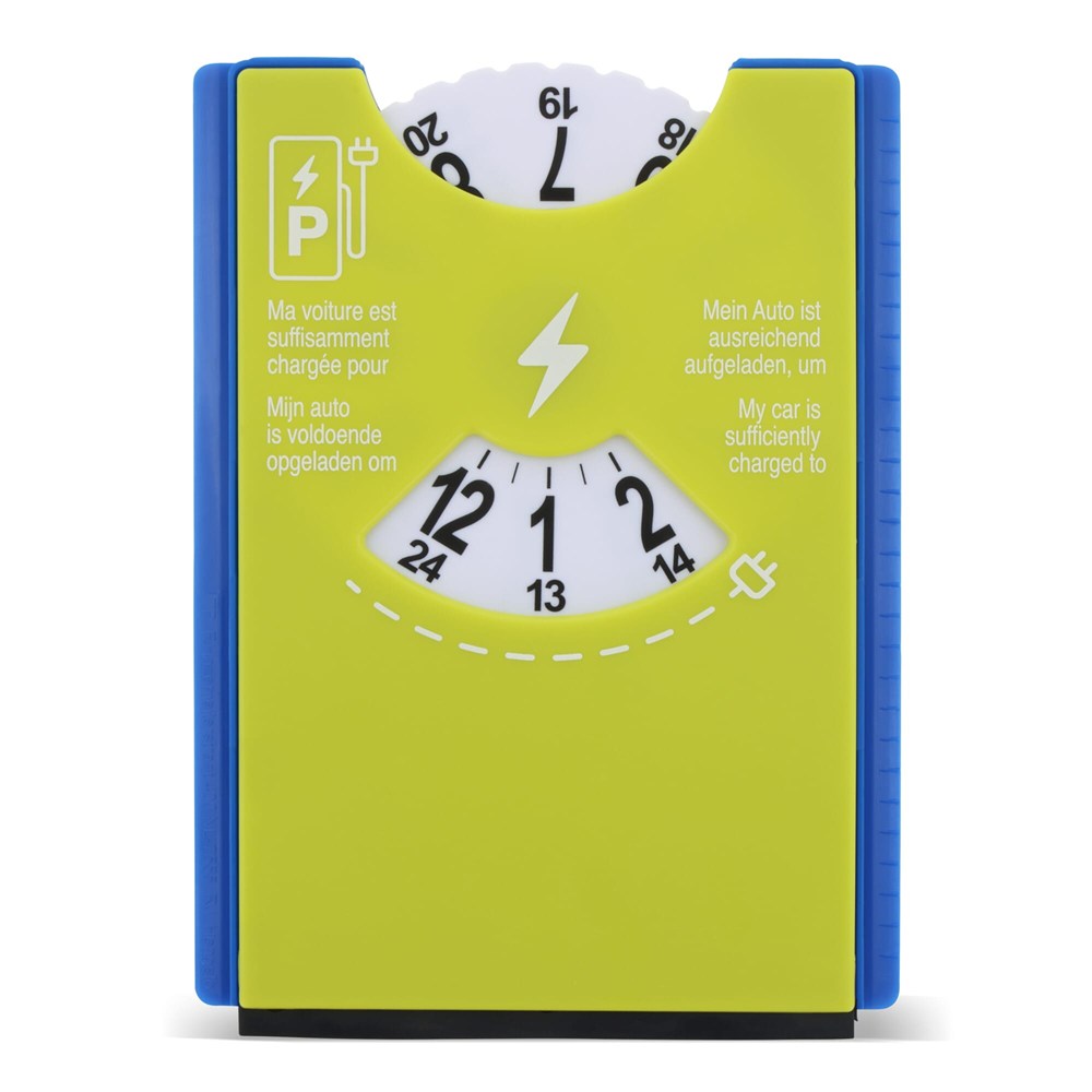 Parkeerschijf met ijskrabber die voldoet aan de Europese wetgevingen (exclusief Frankrijk). De blauwe zijde kan als regulierie parkeerschijf gebruikt worden terwijl de groene zijde gebrukt kan worden tijdens het laden van uw electtrische- of hybride auto.