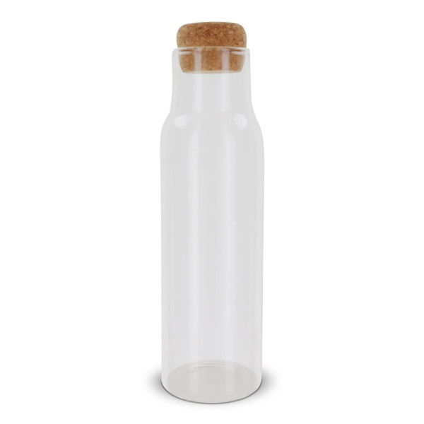 Fles van borosilicaatglas met een deksel van kurk. De combinatie van glas en kurk geeft de karaf een natuurlijke uitstraling. Serveer water, sappen of andere (koolzuurhoudende) dranken in deze fles. Dankzij de sluiting met deksel kan deze fles ook zonder problemen op het terras worden gebruikt.