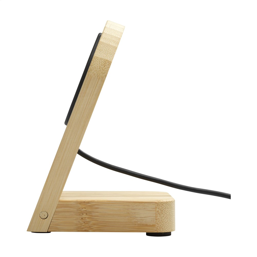 Een magnetische, draadloze 15W snellader en telefoonstandaard in één, gemaakt van bamboe. Deze snellader is geschikt voor het opladen van de iPhone 12 en hoger. Plaats de telefoon op de lader en de magnetische oplader lijnt zich automatisch uit met de magneet in de iPone en begint automatisch met opladen. Inclusief USB-C kabel en een USB-C 20W-wandlader die voor dit product vereist is. Per stuk in kraft doos.