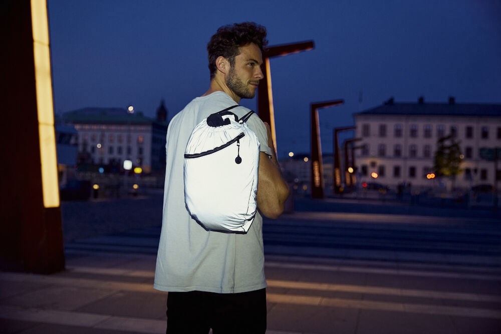 Opvallende, reflecterende rugzak voor extra zichtbaarheid. De tas heeft een hoofdcompartiment, een kleiner compartiment aan de voorzijde en een handige oplossing voor een koptelefoon. Afmetingen en volume: 48x35,5cm ≈ 10L