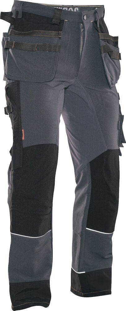 Geavanceerde broek in een zeer hoogwaardige en comfortabele 4-way stretch Ripstop kwaliteit gecombineerd met zeer slijtvaste polyamide en Cordura® versteviging voor extra duurzaamheid. De broek is voorzien van diverse zakken zoals een duimstokzak met mes-bevestigingsknoop, ruime verstevigde holsterzakken, deels loshangende achterzakken en een zak op het been met rits, telefoonvakje en ruimte voor een ID-kaart. Verder is de broek professioneel afgewerkt met een hamerlus, extra riemlussen bij de grote maten, siliconen in de band om het shirt op zijn plek te houden en reflecterend tape. De kniestukken kunnen op twee hoogtes worden geplaatst om de beste positie voor optimale bescherming te kunnen garanderen. De voorgevormde knieën en mesh in de knieholtes zorgen voor een optimaal draagcomfort. Gecertificeerd volgens EN 14404:2004+A1:2010 Type 2 Level 1 in combinatie met Jobman kneepads 9943, 9944 en 9945.