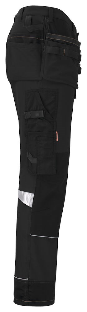 Geavanceerde broek in een zeer hoogwaardige en comfortabele 4-way stretch Ripstop kwaliteit gecombineerd met zeer slijtvaste polyamide en Cordura® versteviging voor extra duurzaamheid. De broek is voorzien van diverse zakken zoals een duimstokzak met mes-bevestigingsknoop, ruime verstevigde holsterzakken, deels loshangende achterzakken en een zak op het been met rits, telefoonvakje en ruimte voor een ID-kaart. Verder is de broek professioneel afgewerkt met een hamerlus, extra riemlussen bij de grote maten, siliconen in de band om het shirt op zijn plek te houden en reflecterend tape. De kniestukken kunnen op twee hoogtes worden geplaatst om de beste positie voor optimale bescherming te kunnen garanderen. De voorgevormde knieën en mesh in de knieholtes zorgen voor een optimaal draagcomfort.