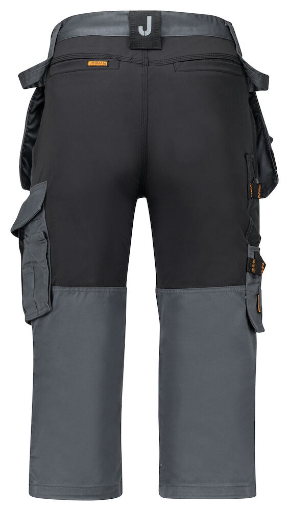 Technische driekwart werkbroek voor vloerenleggers van onderhoudsvriendelijk polyester/katoen dat zijn kleur en vorm behoudt. De broek heeft stretchpanelen aan de achterzijde voor extra flexibiliteit, ruime voorzakken, holsterzakken met extra vakken en een extra ritssluiting, paspelzakken aan de achterzijde, een beenzak met een extra vak en klep met klittenbandsluiting, een duimstokzak met ruimte voor een mes en een dijbeenzak voor vloerleggersmessen. De kniestukzakken zijn verstevigd en de kniestukken kunnen op twee hoogtes geplaatst worden. Gecertificeerd volgens EN 14404:2004+A1:2010 Type 2 Level 1 samen met Jobman kneepads 9943, 9944 en 9945.