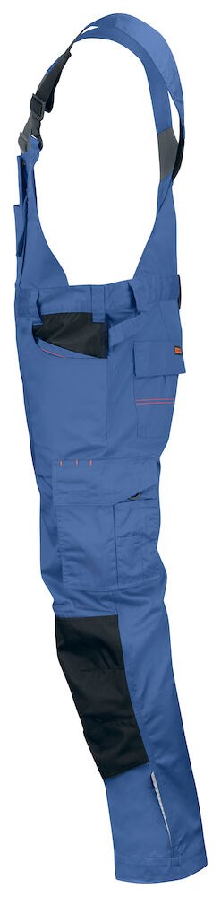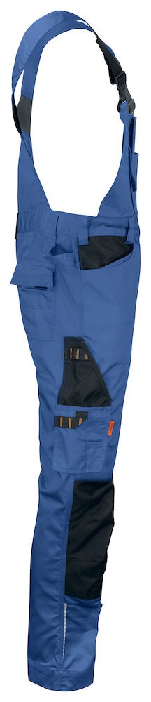 Praktische bib ’n brace overall gemaakt van kleur- en vormvast easy-care polyester/katoen. De broek is voorzien van diverse zakken zoals, borstzak met klep en klittenbandsluiting, holsterzakken met extra compartimenten met rits, achterzakken met klep en klittenbandsluiting, zak op het been met compartiment en klittenbandsluiting en een duimstokzak met ruimte voor een mes. De overall is verstevigd bij de kniestukzakken. Maten C42-C64 kunnen gemakkelijk met 5 cm worden verlengd door de omslag in de broekspijp.