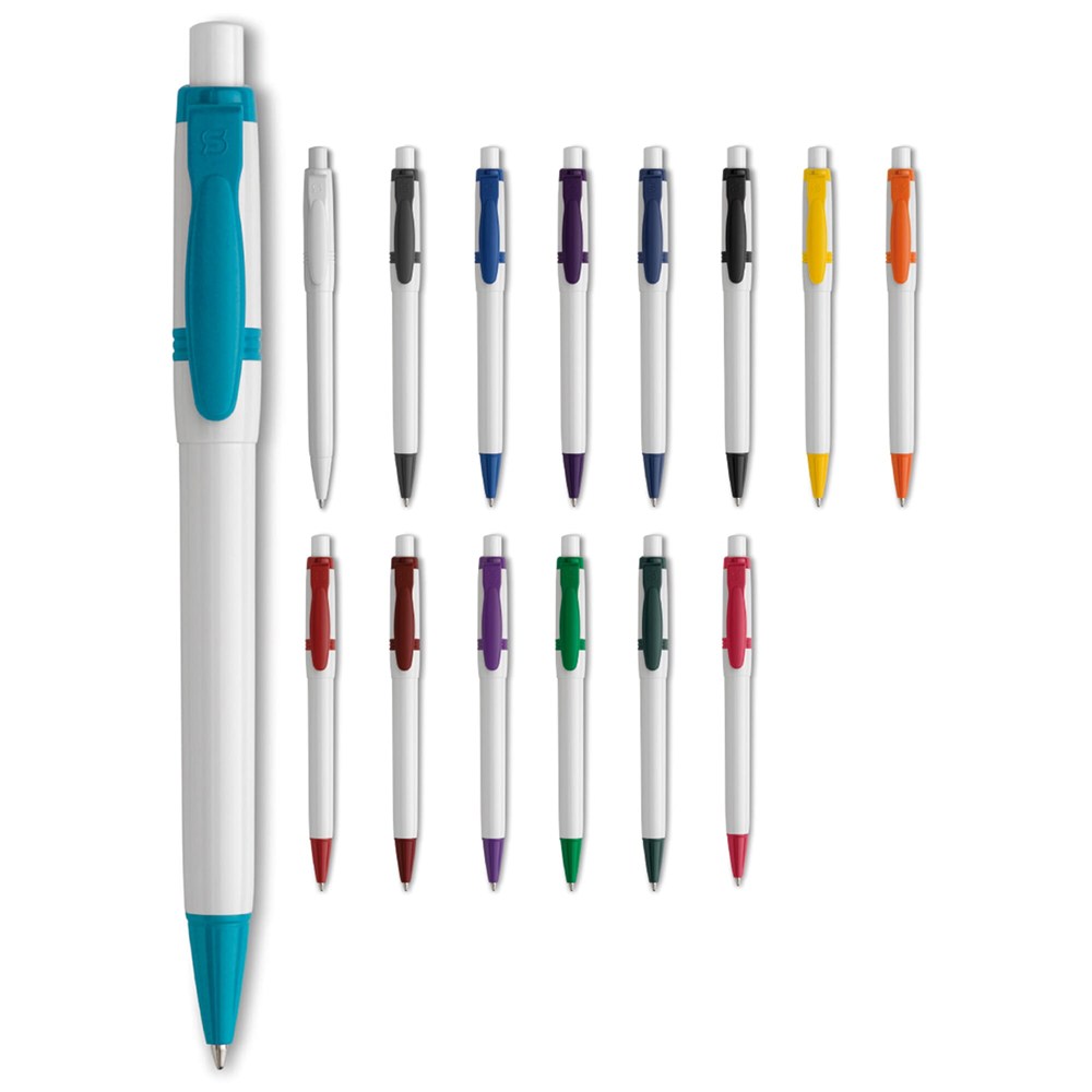 Hardcolour balpen Olly met een witte barrel en gekleurde clip. Inclusief een Jumbo vulling met blauw schrijvende inkt. De pen heeft een drukmechaniek en is gemaakt van ABS kunststof. Geproduceerd in Europa. Kleur combinaties voor deze pen zijn mogelijk vanaf 5.000 stuks.