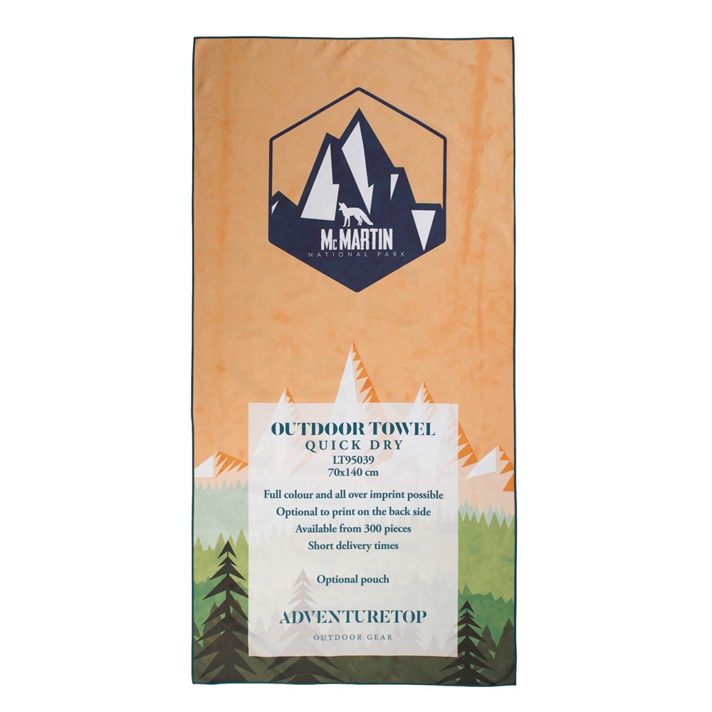 Outdoor handdoek gemaakt van sneldrogend microfiber (200g/m², 1400x700mm). Inclusief een custom-made full-colour print op één zijde. Optioneel kan de andere zijde ook bedrukt worden. Ook de kleur van de zoom is aan te passen.