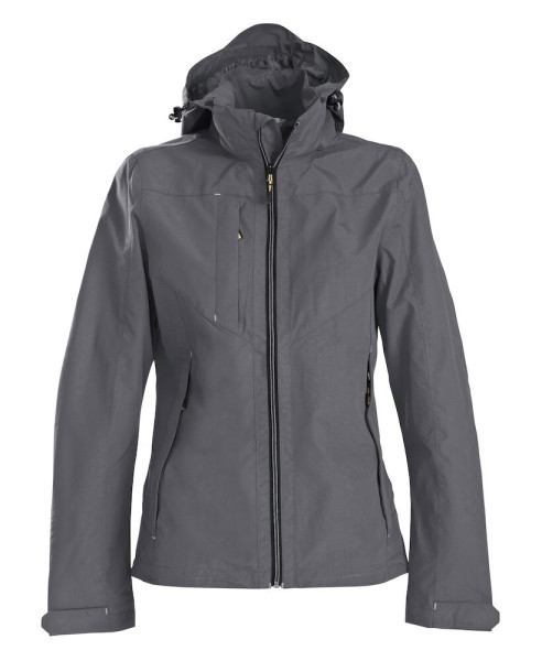 Sportieve hardshell jas voor dames in een moderne look en met verschillende praktische zakken. Tweekleurige ritssluiting vooraan en decoratieve stiksels. zipper pullers in contrasterende kleur. Deze kunnen indien gewenst vervangen worden door één van de andere beschikbare kleuren.