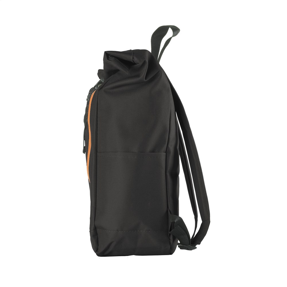 Stoere, praktische urban ‘roll-top’ rugzak van sterk 600D polyester met waterbestendige PVC binnenzijde, gedeeltelijk nylon gevoerd. De rugzak heeft één groot binnenvak, een insteekvak aan beide zijdes en een groot ritsvak aan de voorzijde. Met foam rugzijde voor meer draagcomfort, gewatteerde, en verstelbare schouderriemen. Met draaglus en een rolsluiting met kliksysteem aan de bovenzijde. De perfecte tas voor dagelijks gebruik. Inhoud ca. 18 liter.