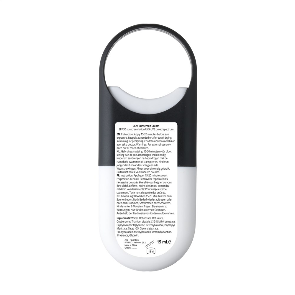 Beschermende zonnebrandlotion (factor 30) in handzaam, kunststof flacon met verstuiver en groot ophangoog. Houdbaar tot 12 maanden na opening. Inhoud 15 ml. Ingrediënten: Water, Octinoxate, Octisalate, Oxybenzone, Titanium dioxide, C12-15 alkyl benzoate, Caprylic/capric triglyceride, Cetearyl alcohol, Isopropyl Myristate, Ceteth-25, Glyceryl stearate, Proplyparaben, Methylparaben, Dmdm hydantoin, Fragrance, Glycerin.