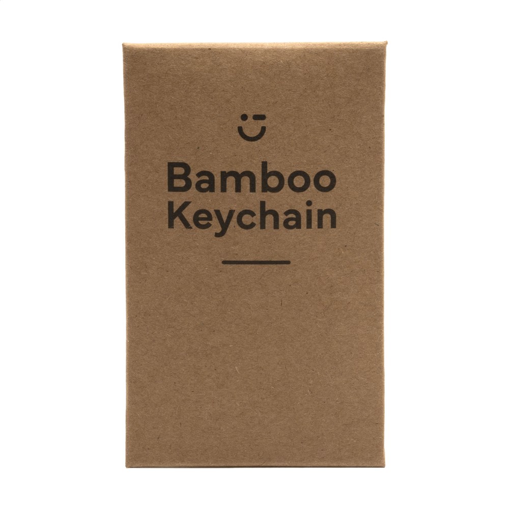 Ronde, hoogglans, metalen sleutelhanger met bamboe houten inlay en stevige sleutelring. Per stuk in kraft envelop.