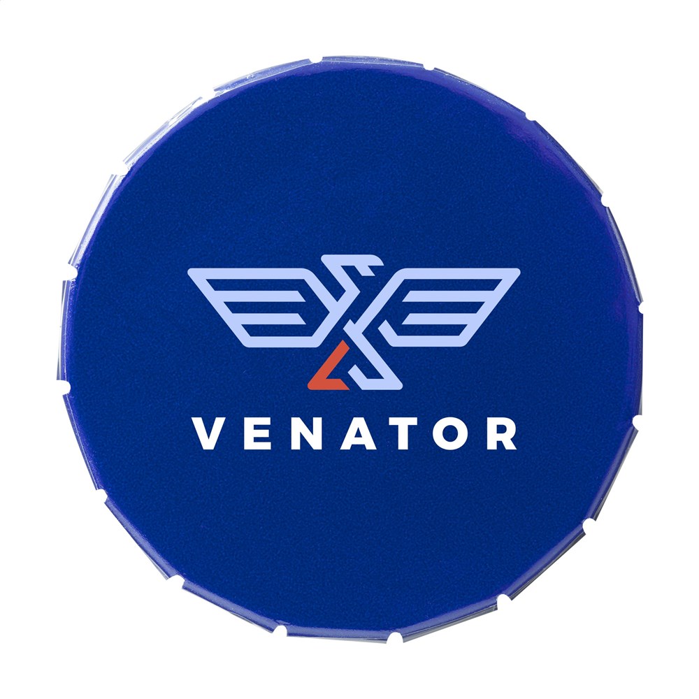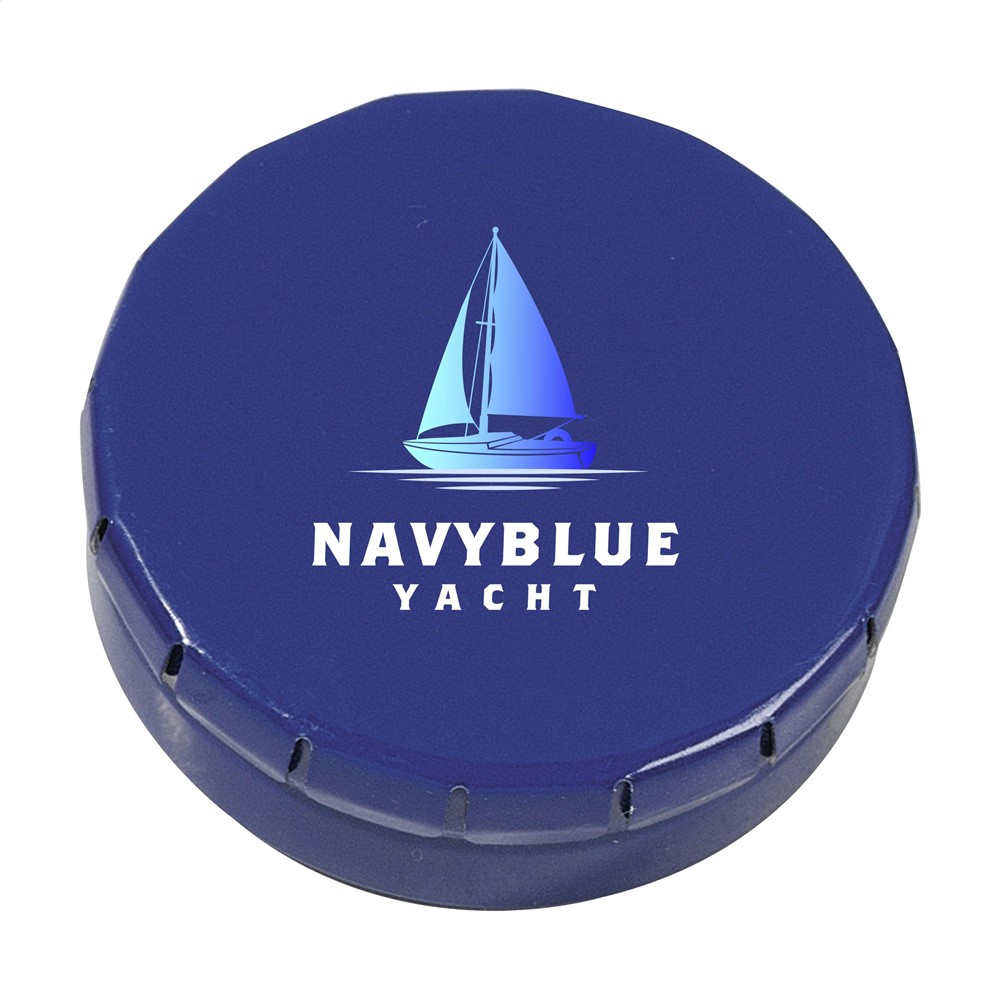 Uitdeelblikje met handig druk-/kliksysteem. Gevuld met ca. 12 g snoepjes.