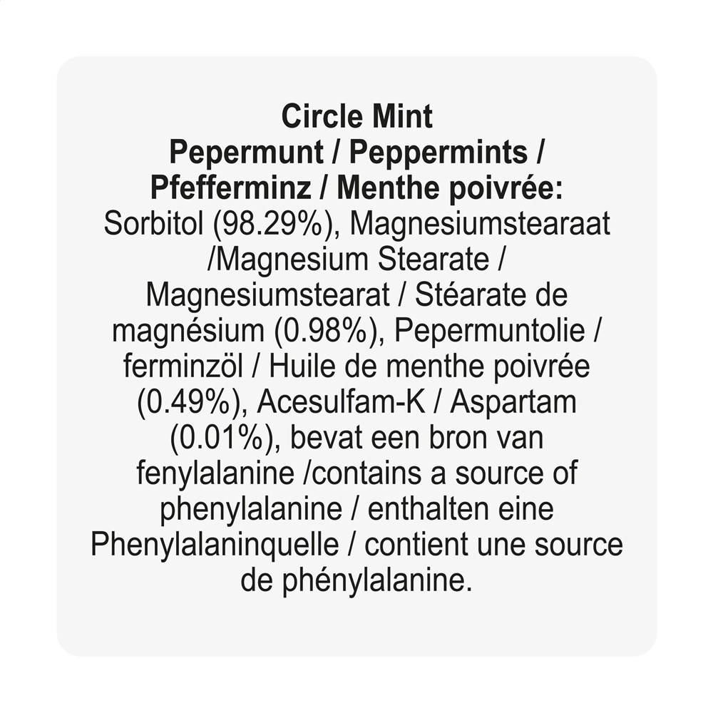 Ronde, kunststof dispenser gevuld met ca. 12 gram (ca. 55 stuks) frisse, suikervrije pepermuntjes.