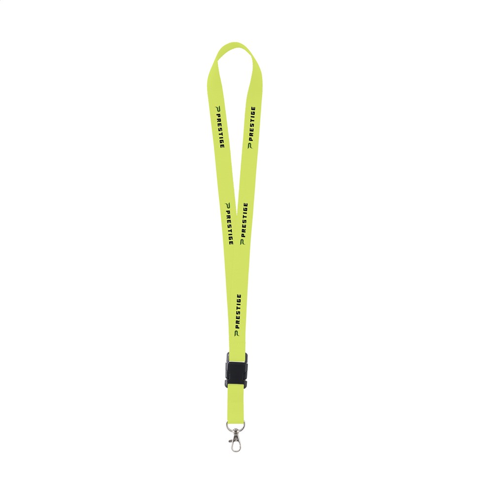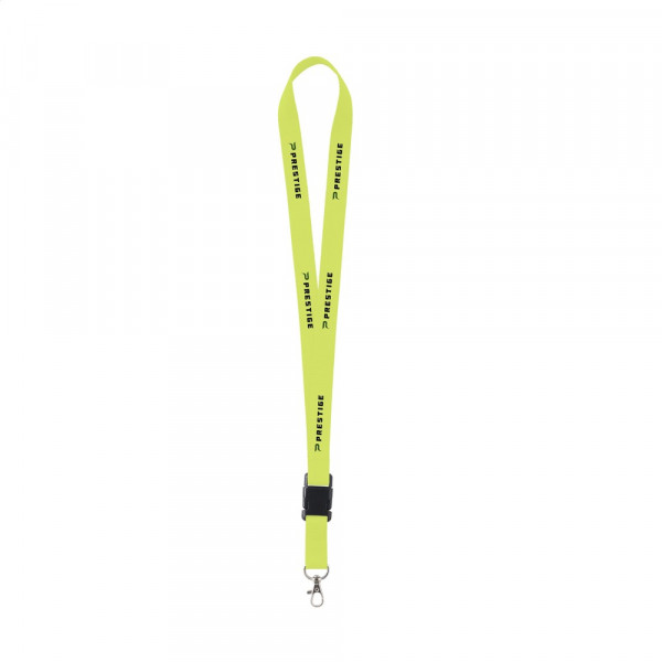Lanyard van sterk geweven polyester met metalen karabijnhaak. Het onderste gedeelte is los te koppelen d.m.v. een kunststof kliksysteem.