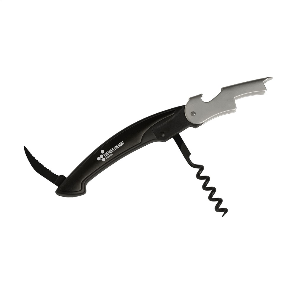 Schitterend vormgegeven, uitklapbaar kelnermes van RVS gecombineerd met aluminium. Met kurkentrekker, flesopener en loodsnijder. Per stuk in kraft doos.