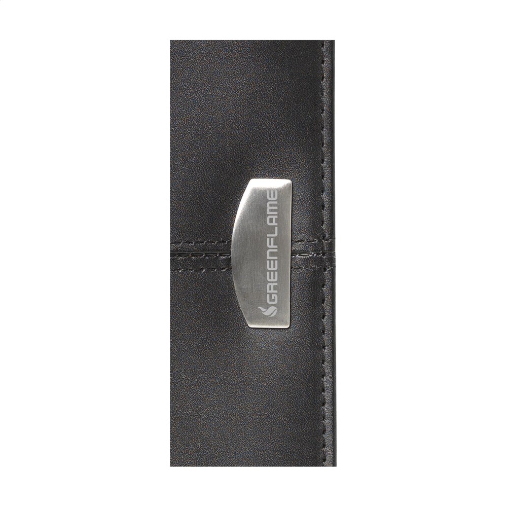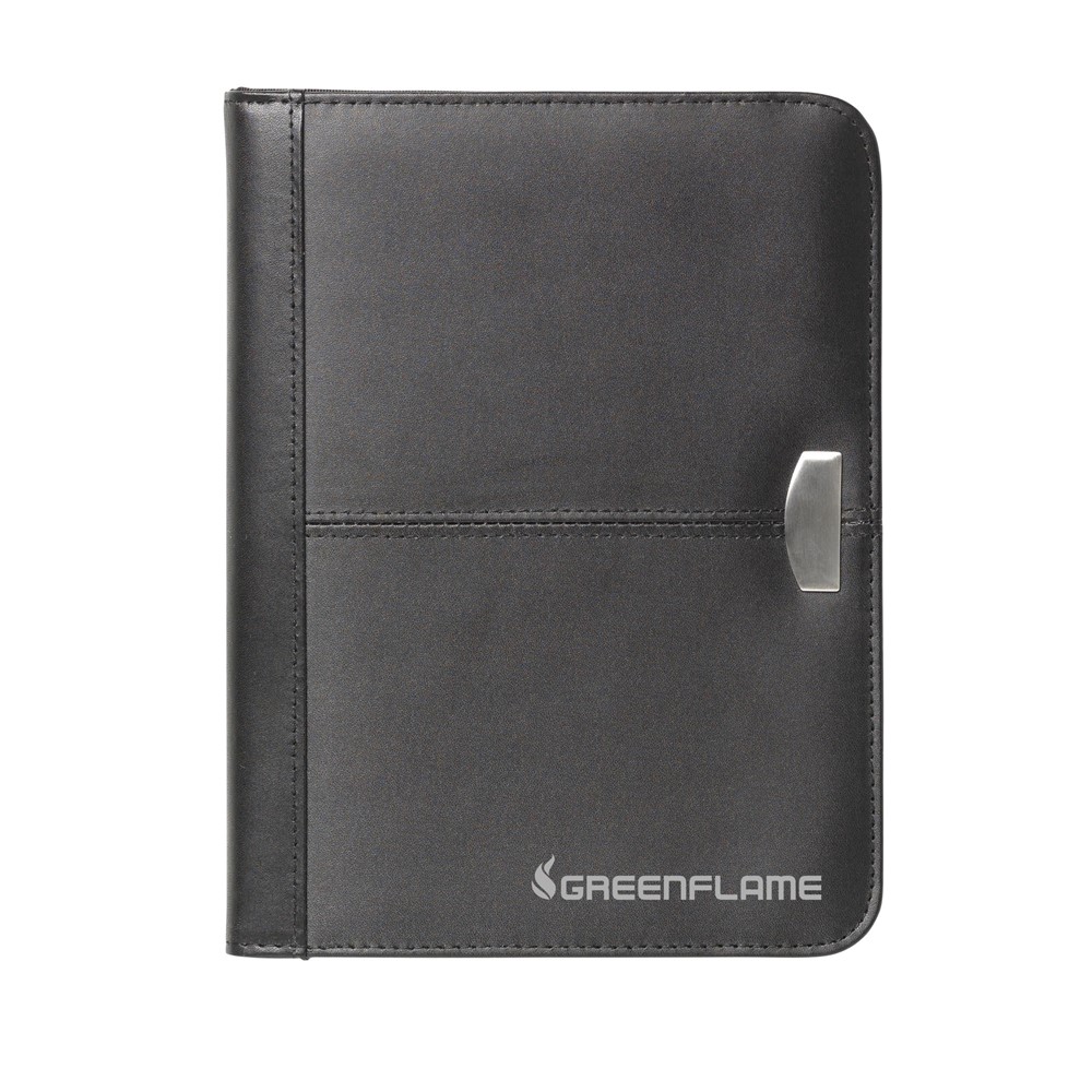 Schrijfmap/documentenmap van fijn gebonden leder, in A5-formaat. Met diverse insteekvakken en rits rondom. Incl. schrijfblok en balpen. Per stuk in doosje.