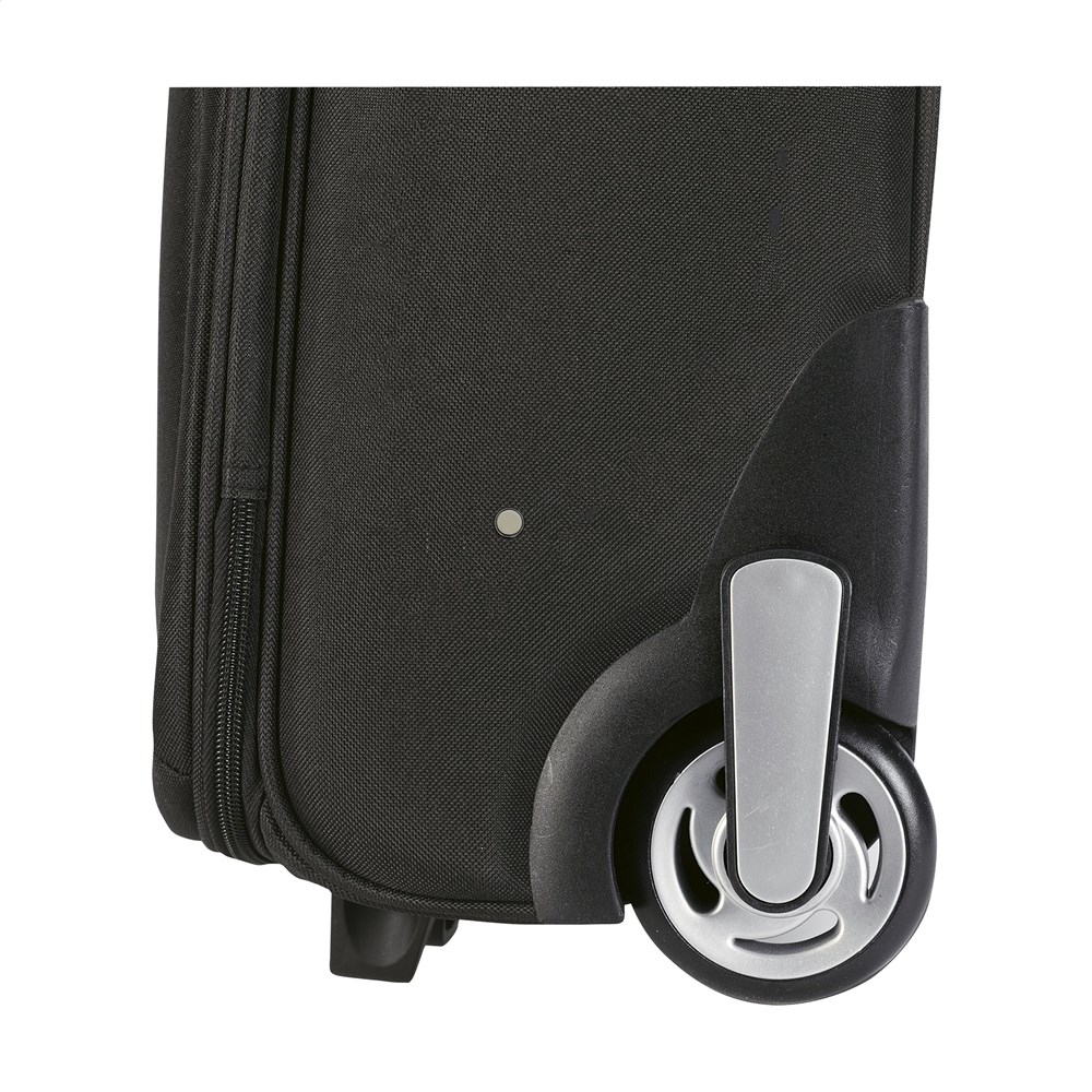 Trolley van 1000D polyester met royaal hoofdvak, dubbele rits, diverse insteekvakken, 2 wielen en uitschuifbare aluminium handgreep. Inhoud ca. 22 ltr. Per stuk in verzendklare doos.