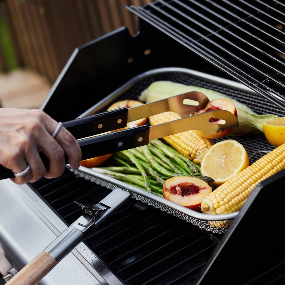 Fredde BBQ barbecuegerei van Sagaform met een praktisch ontwerp van roestvrij staal met zwart gebeitste handgrepen van hout en een goede grip voor eenvoudig gebruik, perfect voor een barbecue.