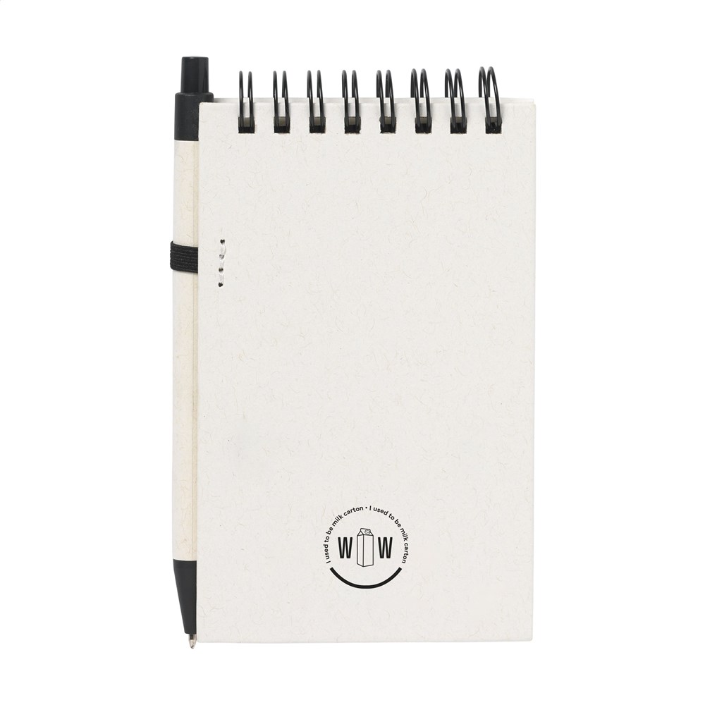 WoW! A6-notitieboekje waarvan zowel de cover als het papier gemaakt is van het overgebleven papier van gerecyclede melkpakken (tot 70%) en 30% gerecycled papier. Het notitieboekje is ringgebonden en heeft ca. 70 vel/140 pagina's crèmekleurig, gerecycled, gelinieerd papier (80 g/m²). Het wordt geleverd inclusief een bijpassende blauwschrijvende balpen, gemaakt van gerecyclede melkpakken. Door het gebruik van gerecycelde materialen kunnen kleine oneffenheden in het materiaal zichtbaar zijn. Dit geeft het product een unieke uitstraling.