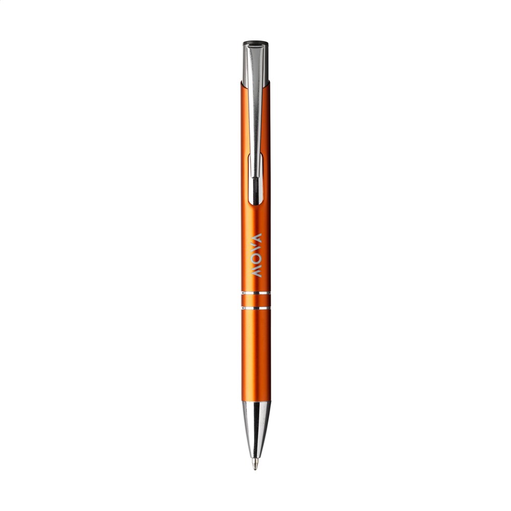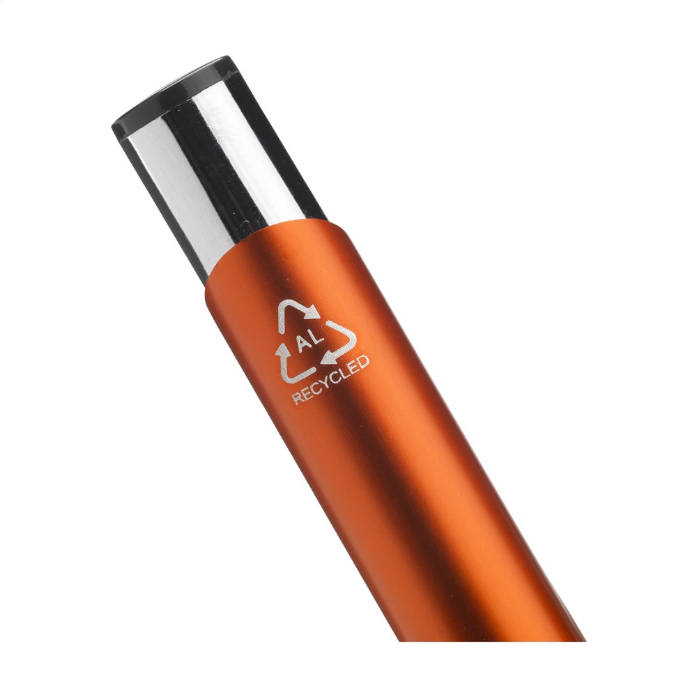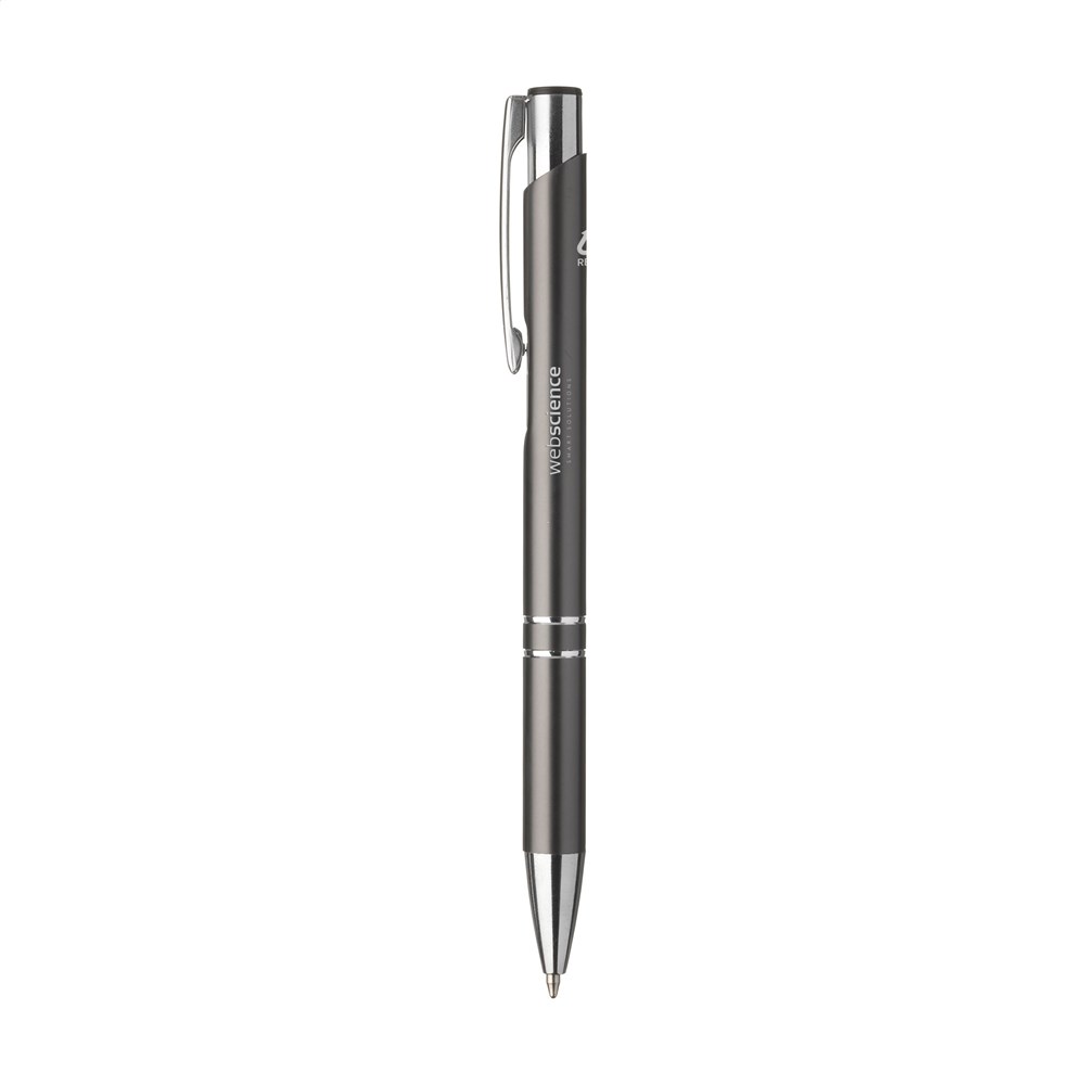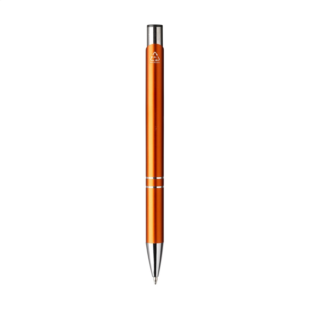 WoW! Blauwschrijvende balpen gemaakt van gerecycled aluminium. De houder is afgewerkt met een mooie glanzende, metallic look finish. Met metalen clip. Door het gebruik van gerecycled aluminium worden er minder nieuwe grondstoffen gebruikt tijdens de productie van dit product. Dit betekent minder energieverbruik en minder gebruik van water.