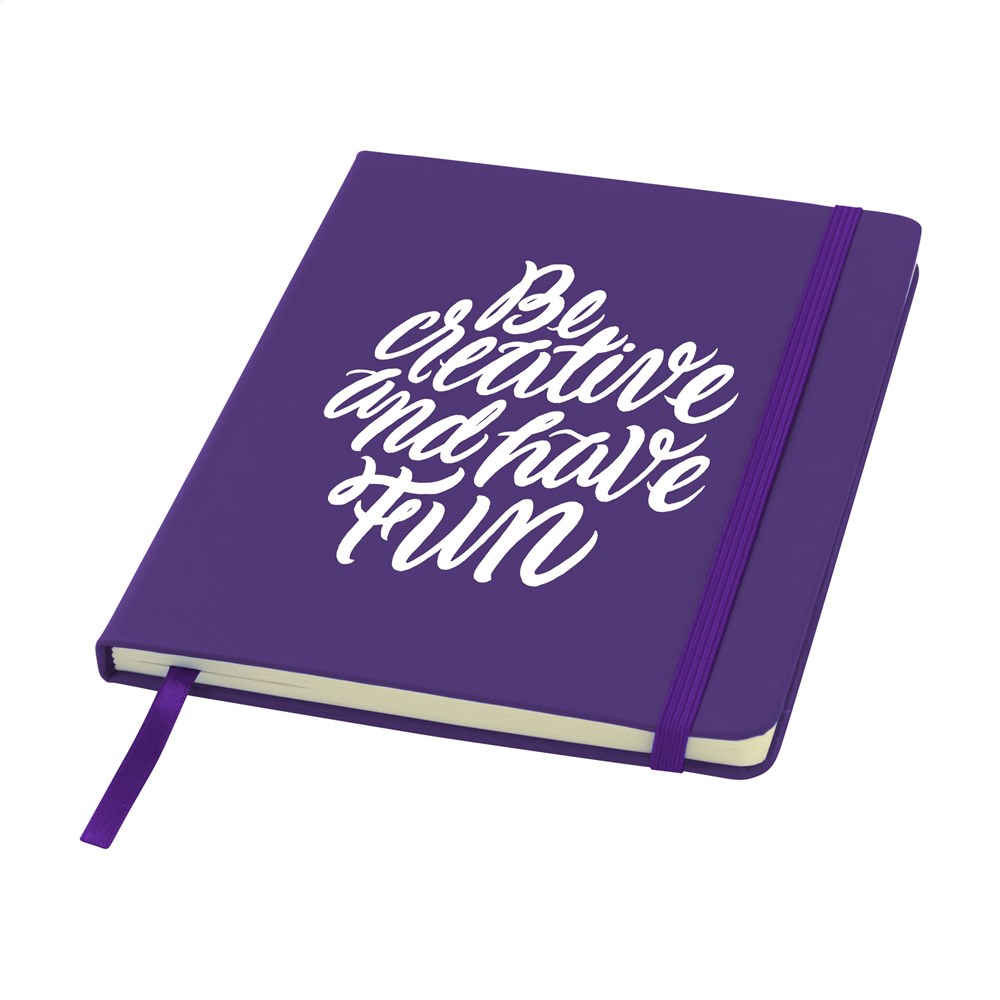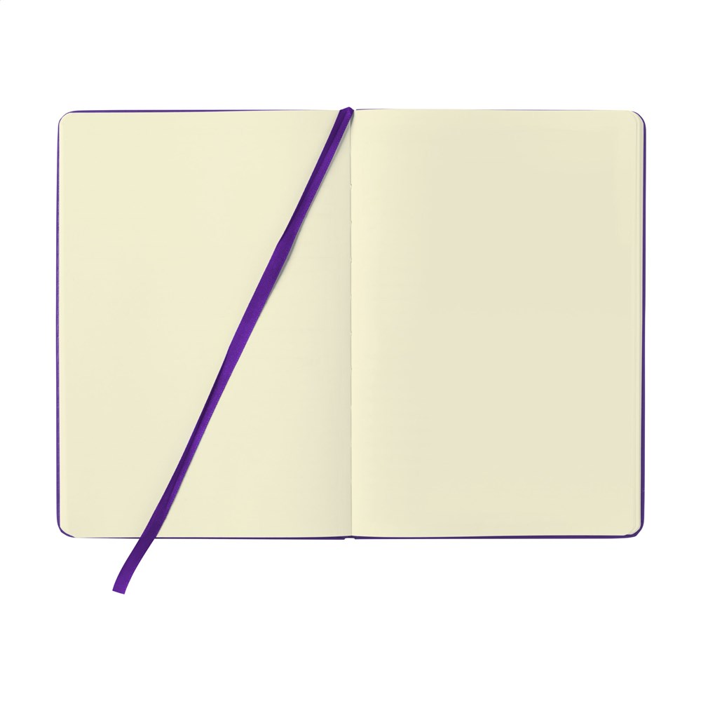 Praktisch notitieboekje in A5-formaat. Met harde PU cover, ca. 80 vel/160 pagina's crèmekleurig, ongelinieerd FSC Mix papier (70 g/m²), elastische sluiting en leeslint.