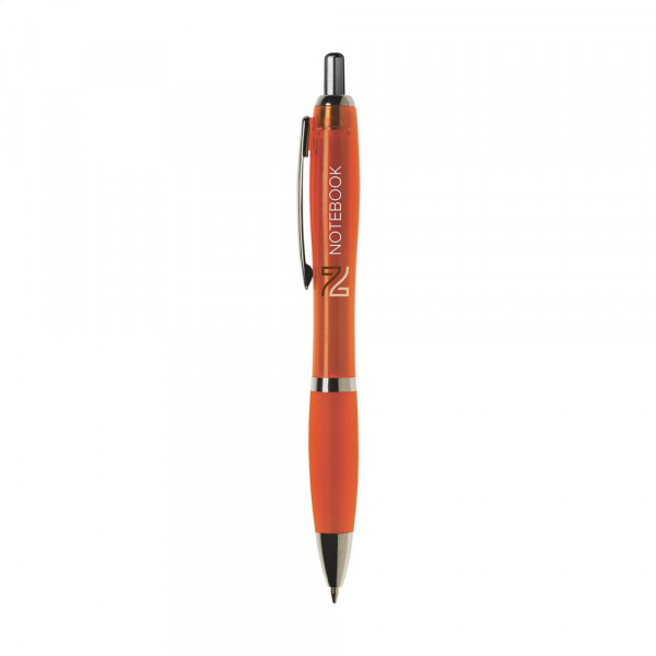 Blauwschrijvende óf zwartschrijvende balpen met transparantgekleurde houder, gripvast voorstuk en metalen clip.