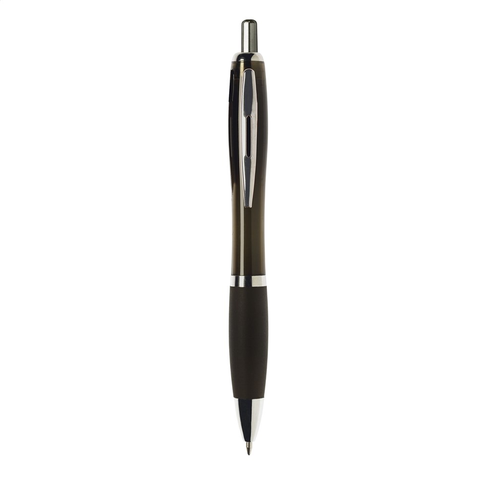 Blauwschrijvende óf zwartschrijvende balpen met transparantgekleurde houder, gripvast voorstuk en metalen clip.