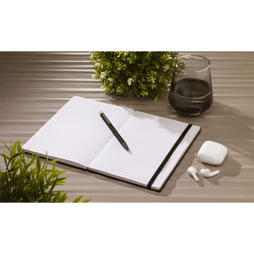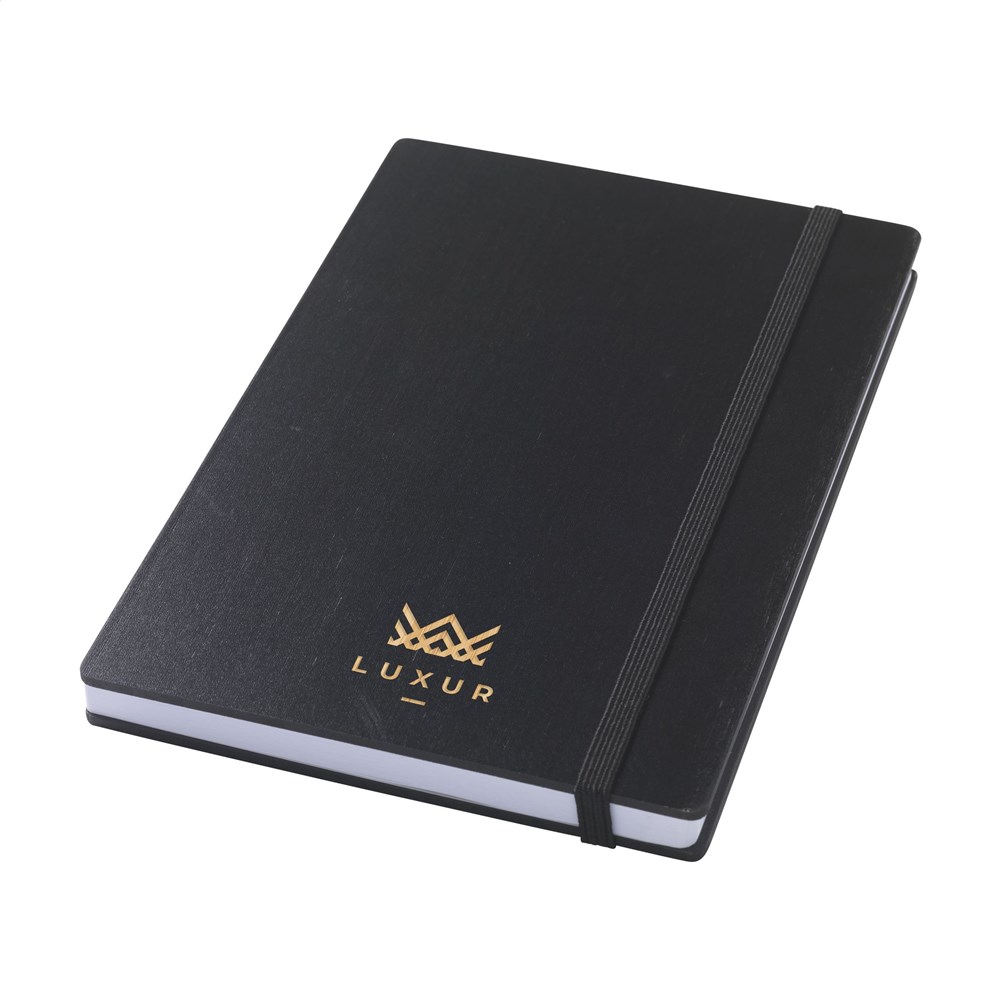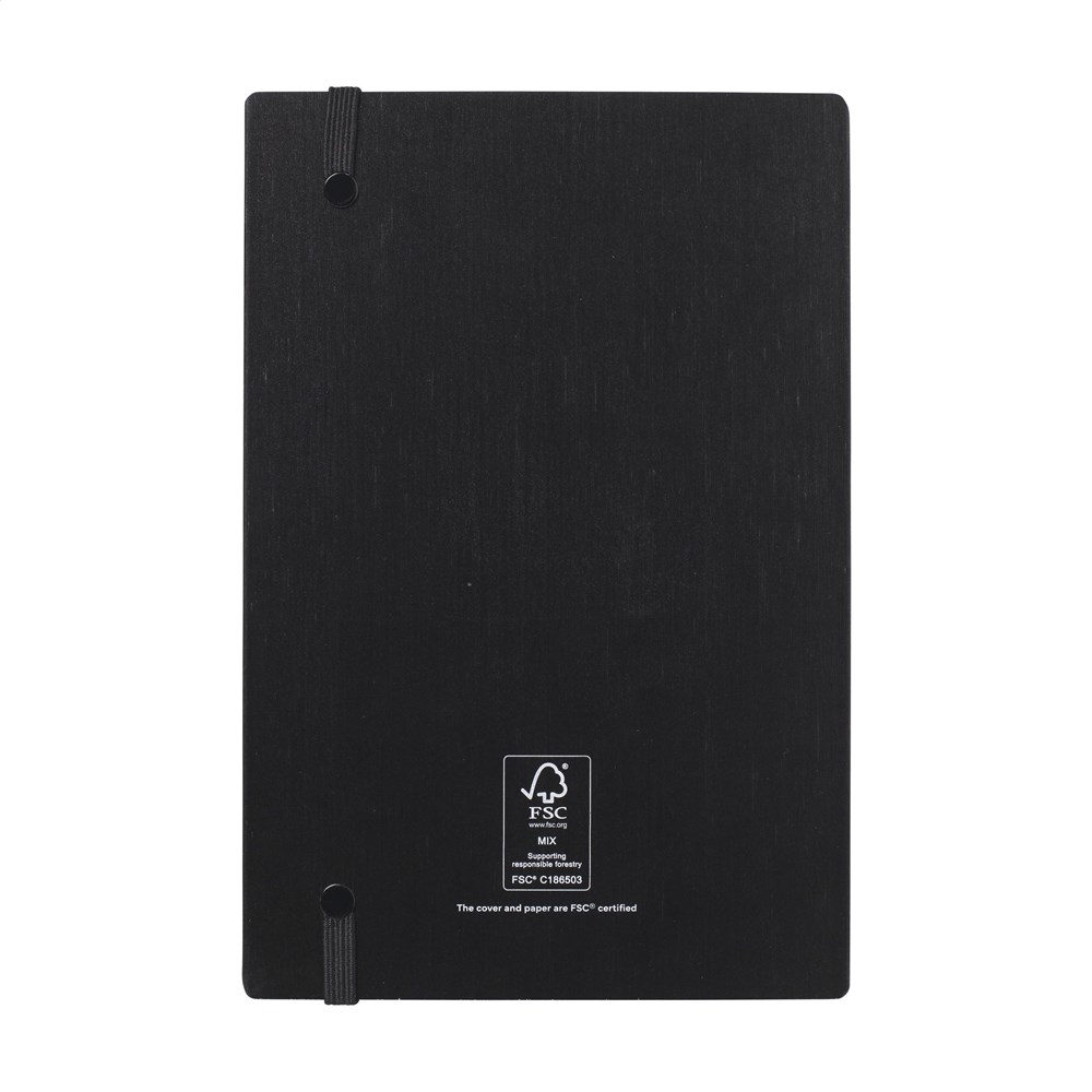 WoW! A5-formaat notitieboek met stevige, zwartgelakte FSC 100% gecertificeerd bamboe hardcover. Opvallend is de zogenaamde -naked spine binding-, speciaal ontworpen om het boekje helemaal te openen en zo plat mogelijk geopend neer te leggen. Dat maakt het makkelijker om aantekeningen en schetsen te maken. Met een handige sluitelastiek en ca. 96 vel/192 pagina's wit, gelinieerd, FSC Mix gecertificeerd papier.
