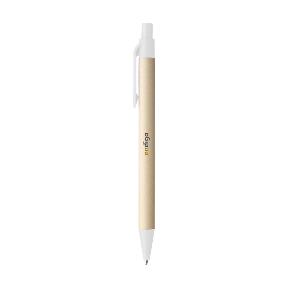 WoW! Balpen met houder van gerecycled papier. De gekleurde clip, drukknop en het puntstuk zijn van biologisch afbreekbaar PLA. Met blauwschrijvende vulling.