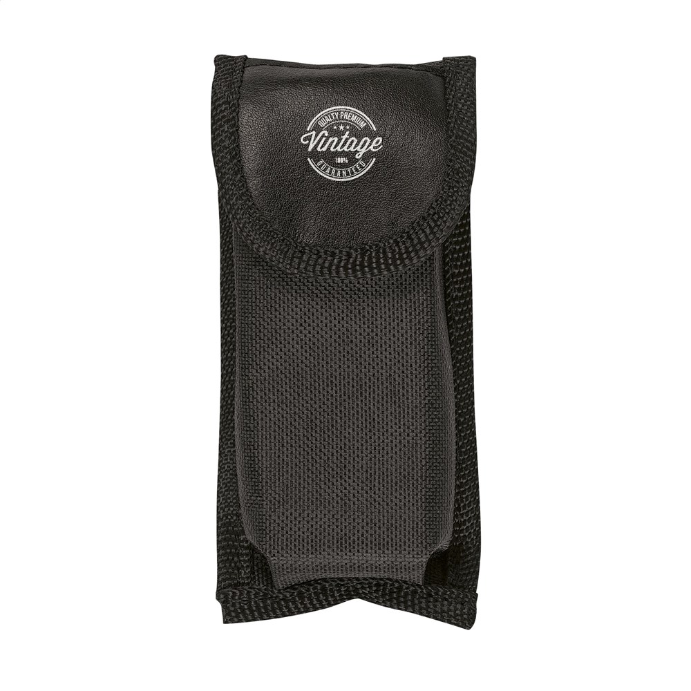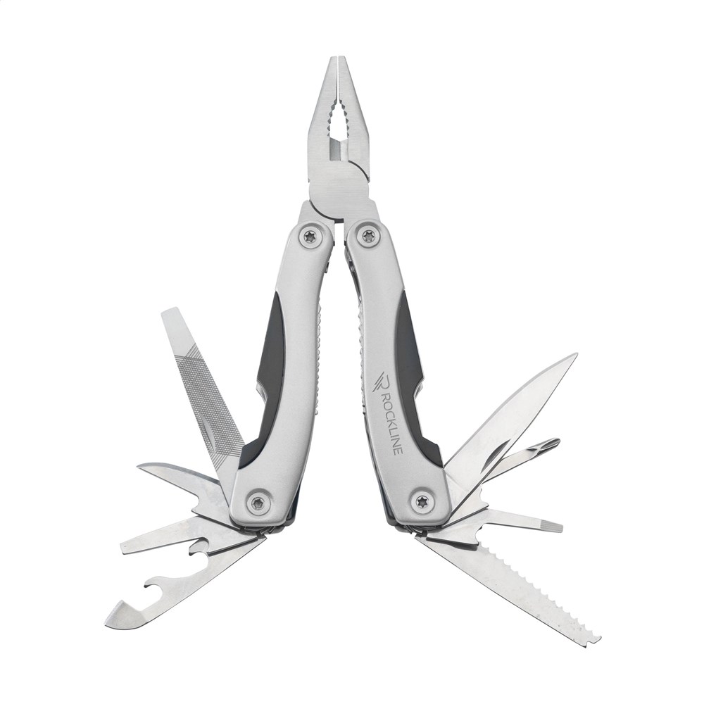 Compacte RVS multitang met aluminium handgreep in metallic look. 9-delig met 13 functies: tang, draadknipper, 3 schroevendraaiers, priem, vijl, blikopener, flesopener, visschraper, visonthaker, mes, philips kruiskopschroevendraaier. Met vergrendeling. In nylon etui. Op het bezit en/of dragen van messen of multitools in het openbaar kunnen lokale regels van toepassing zijn. Per stuk in kraft doos.
