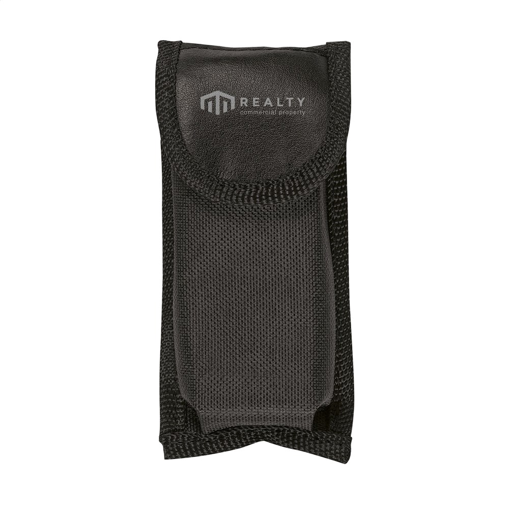 Compacte RVS multitang met aluminium handgreep in metallic look. 9-delig met 13 functies: tang, draadknipper, 3 schroevendraaiers, priem, vijl, blikopener, flesopener, visschraper, visonthaker, mes, philips kruiskopschroevendraaier. Met vergrendeling. In nylon etui. Op het bezit en/of dragen van messen of multitools in het openbaar kunnen lokale regels van toepassing zijn. Per stuk in kraft doos.