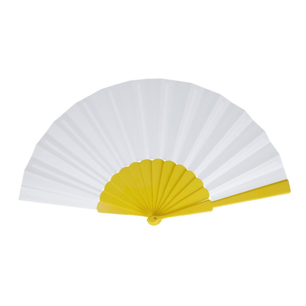 Waaier van kunststof en polyester. Verkrijgbaar in verschillende felle kleuren, ideaal voor buiten evenementen en hete zomerdagen.