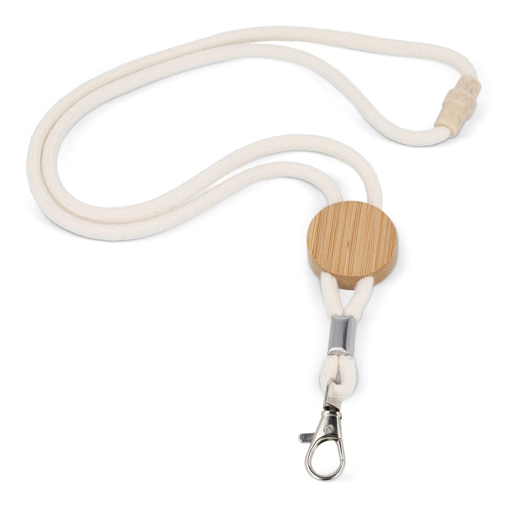 Dit sleutelkoord is gemaakt van duurzaam katoenen koord, met een veiligheidsontgrendeling en metalen clip voor een veilige bevestiging. De bamboe slider vergemakkelijkt het verstellen en biedt ruimte voor branding.