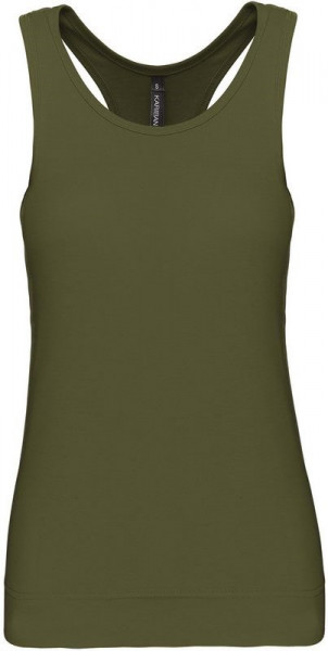 100% katoen 1x1 rib. Racerback. Afwerking met dubbele stiksels.