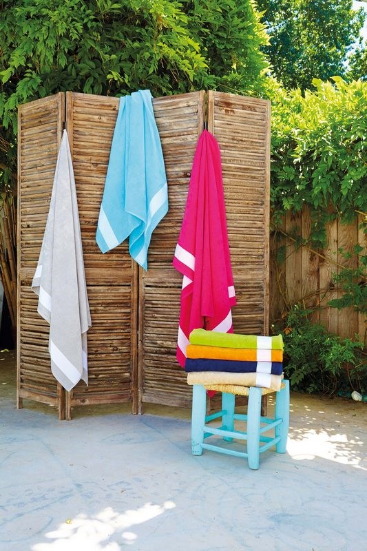 100% katoen. Met wit effen boord van 5,5 cm breed aan beide uiteinden.