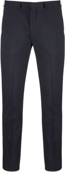 64% polyester / 34% viscose / 2% elasthan. Broek met fitted pasvorm. 2 Italiaanse zakken aan de voorkant en 2 omzoomde achterzakken met knoop. Ritsgulp met haakje en knoop onder lijst. Riem met lussen. 1/2 broekspijp vooraan gevoerd. “Onafgewerkte” onderzijde om een perfect aangepaste zoom te kunnen maken.