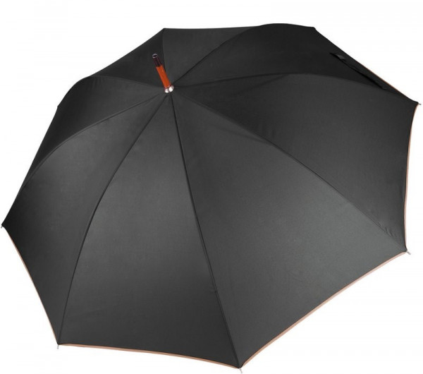 Klassieke paraplu 23" (58,5cm) automatische opening, pongee zijde, zwarte metalen baleinen, houten stok, houten J golf handvat, witte nikkelen metalen uiteinden.