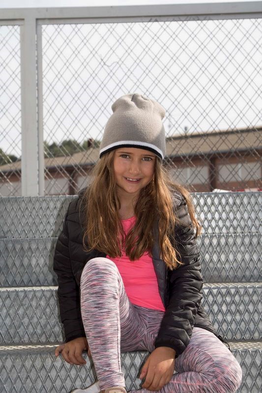 100% acryl. Gebreide muts met contrasterende tweekleurige rand.