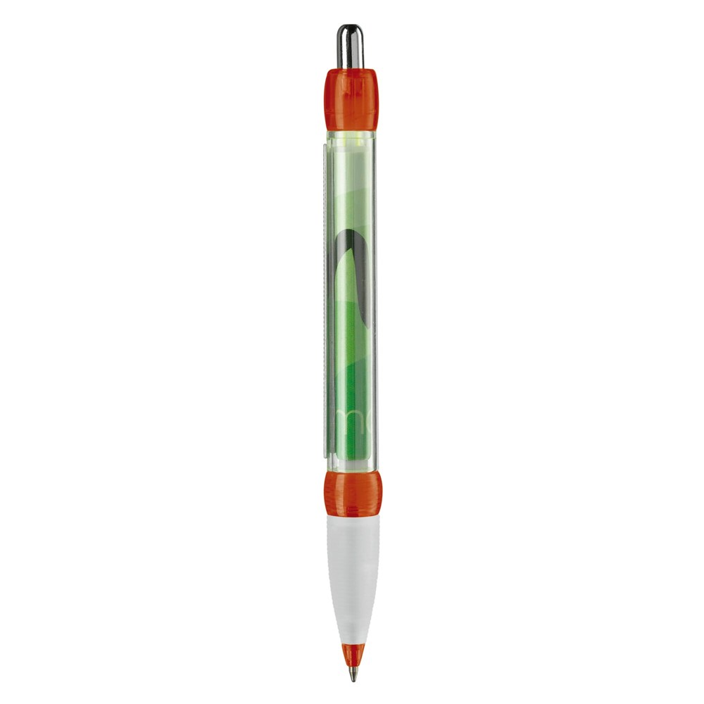 Transparante balpen met rubberen grip. Met full-colour banner bedrukking aan twee zijden. Blauwschrijvende X20 vulling. Bedrukking op de houder of clip mogelijk.