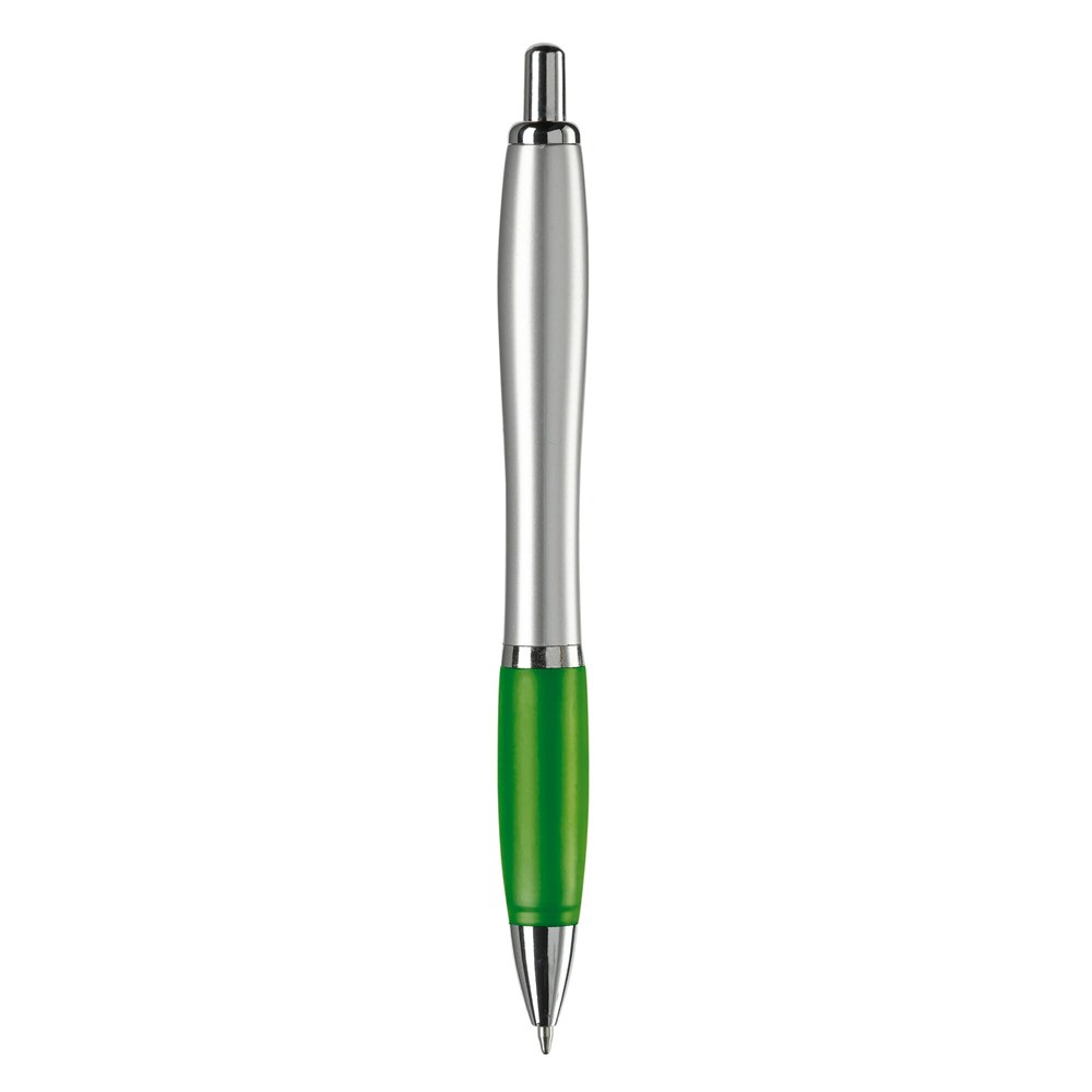 Zilveren balpen met metalen clip, gekleurde grip en een 'metal-look' drukknop, ring en punt. De pen bevat een blauwschrijvende Jumbo vulling.
