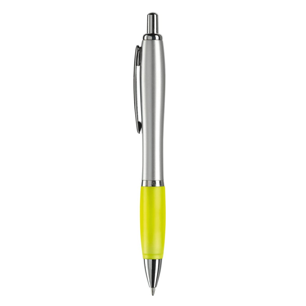 Zilveren balpen met metalen clip, gekleurde grip en een 'metal-look' drukknop, ring en punt. De pen bevat een blauwschrijvende Jumbo vulling.