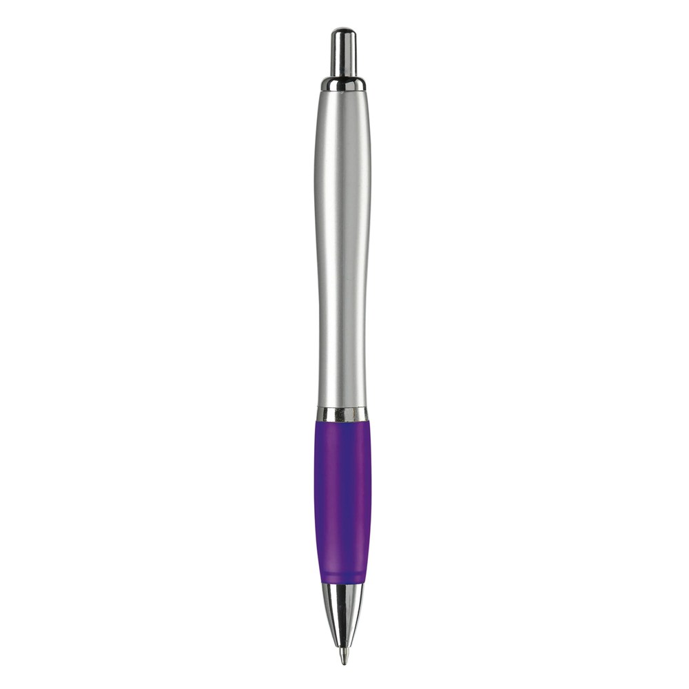 Zilveren balpen met metalen clip, gekleurde grip en een 'metal-look' drukknop, ring en punt. De pen bevat een blauwschrijvende Jumbo vulling.