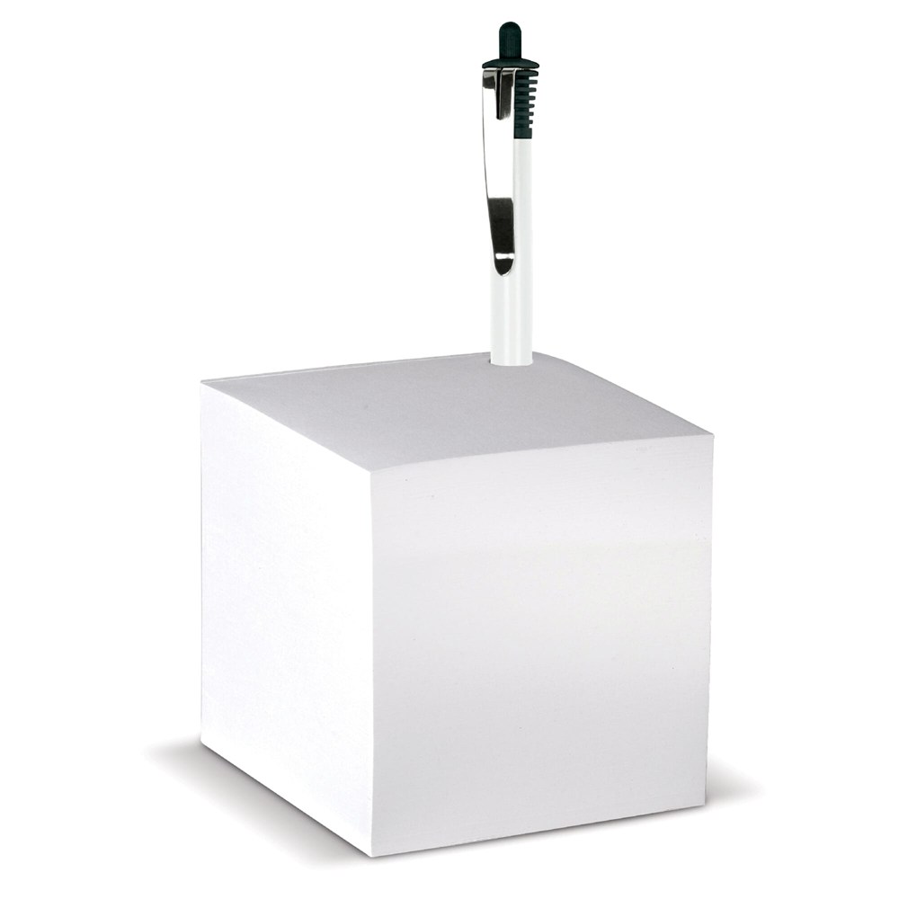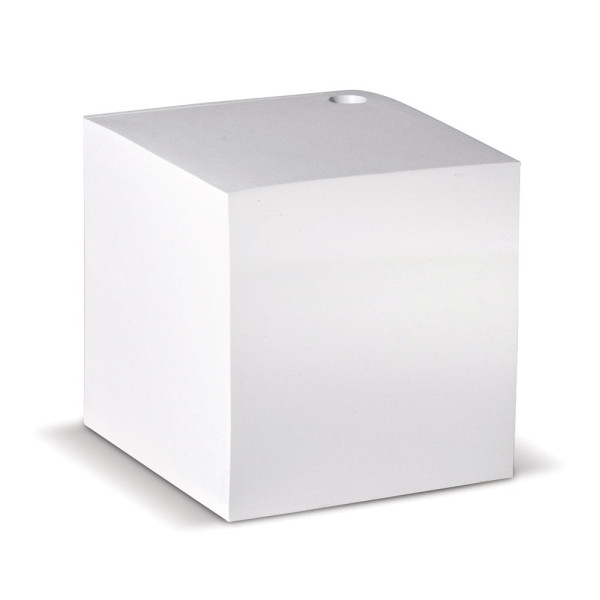 Kubusblok met wit papier en boorgat voor balpen. Circa 840 houtvrije vellen. Enkelbladsbedrukking mogelijk. Wordt per stuk geseald.