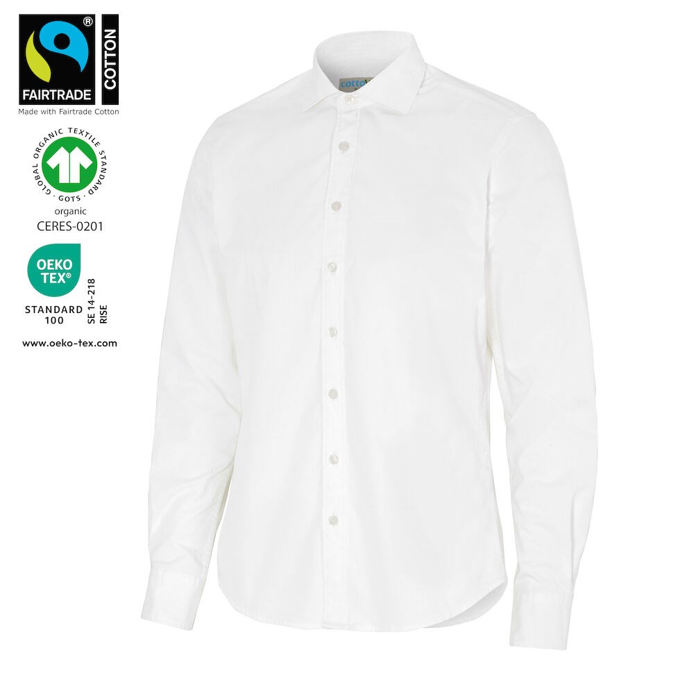 Katoenen shirt in een fijne keperstof met een lichte perzikafwerking die een zacht en soepel gevoel geeft. “Cut away” kraag voor mannen en “turn down” voor het dames model. Het mannen model is beschikbaar in Slim fit en Comfort fit.