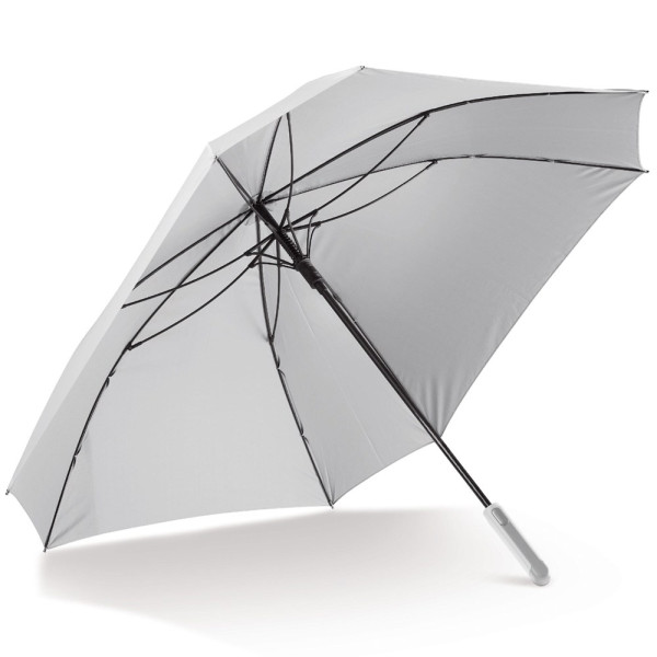 Reis in stijl met deze grote en luxe paraplu. Het stijlvolle vierkante ontwerp creëert een groter oppervlak waardoor deze paraplu groot genoeg is voor twee personen. Het frame opent automatisch, is volledig van sterk glasvezel en windproof. Eenvoudig mee te nemen middels de hoes met schouderband.